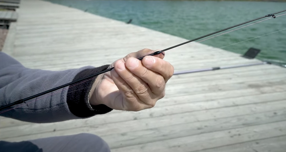 - Под углом 90 градусов между шнуром и удилищем — подача деликатная, спиннинг сглаживает движения.