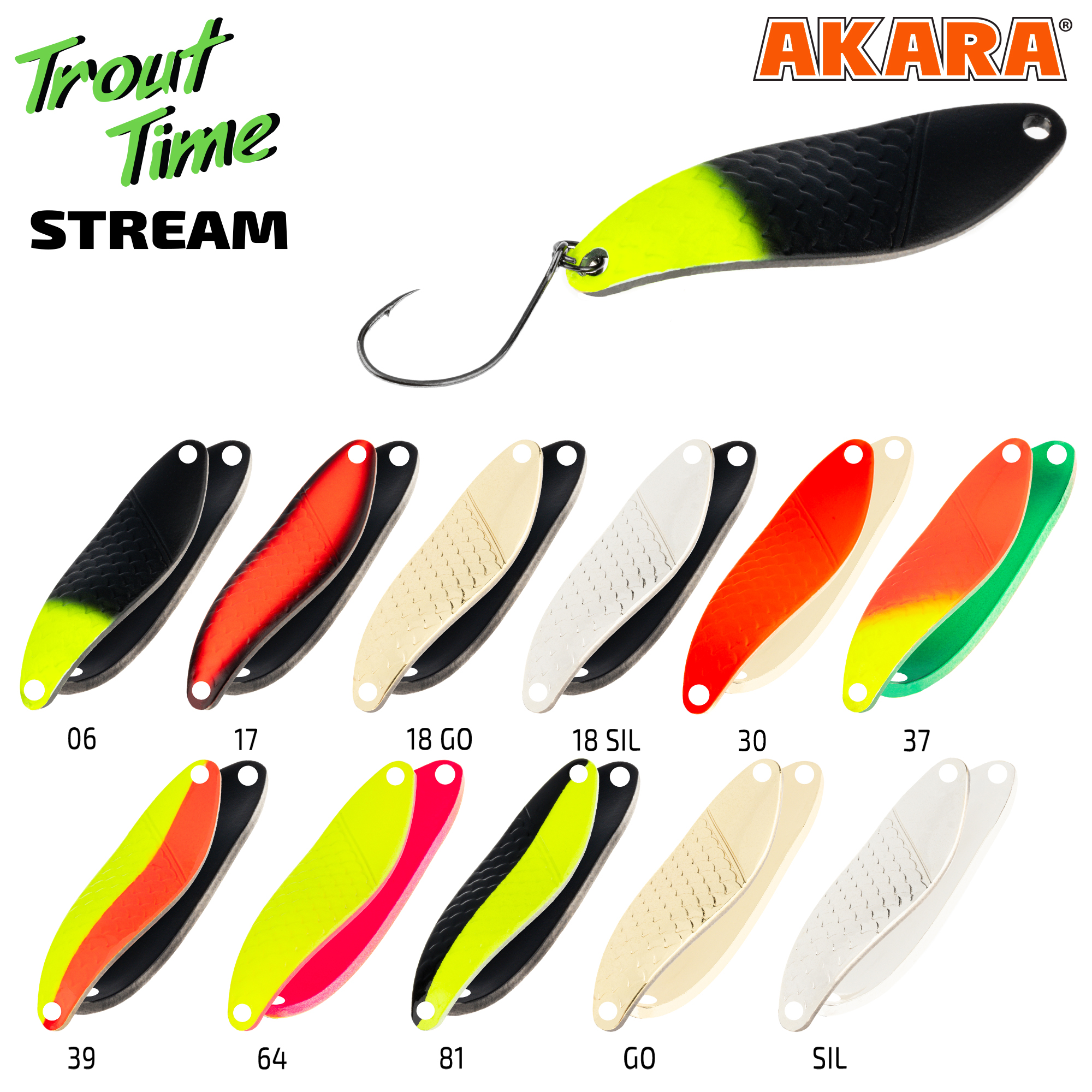 Из названия блесны Akara Trout Time Stream ясно, что ее основное назначение - ловля на течении. Классическая s образная форма подобрана таким образом, чтобы приманка совершала широкие хорошо заметные хищнику колебания, и в то же время ее можно было удержать на струе. Данная модель представлена в трёх размерах. От 4 до 8,5 грамм. Четырехграммовая блесна будет оптимальной приманкой для ловли хариуса, а более крупные колебалки подойдут уже и для хищника покрупнее, таких как кумжа, ленок или лосось. Несмотря на свое стримовое направление, блесна подойдёт и для ловли в стоячих водоемах. Окуни и щуки не останутся равнодушными к агрессивным колебаниям приманки.