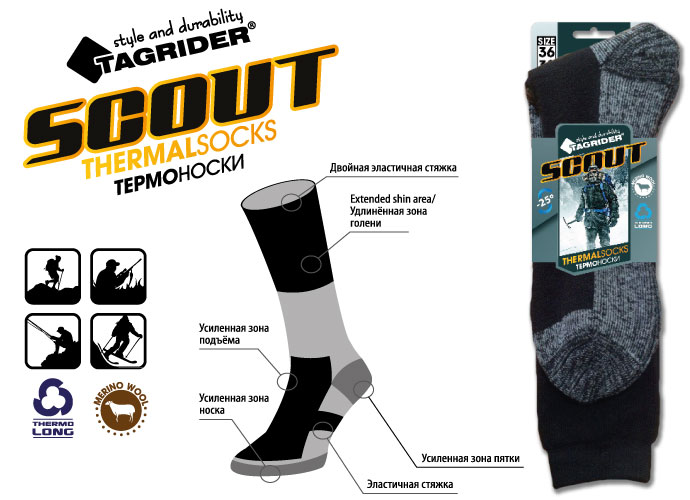 Термоноски Tagrider предназначены для повседневной носки, туризма, охоты и рыбалки в холодную погоду. Шерсть овец-мериносов (Merino Wоо|) отлично сохраняет тепло, впитывает влагу и поглощает запах. Входящий в состав ткани модифицированный полипропилен (PPmod) увеличивает срок службы носков, отлично выводит влагу, сохраняет первоначальную структуру ткани и позволяет носкам быстро сохнуть. Волокна этой ткани производятся по специальной технологии, придающей им структуру капилляров. Мельчайшие капилляры - волокна ThermoLong эффективно отводят влагу, сохраняя комфортный микроклимат. Многозональная структура вязки, выполненная с учётом анатомических особенностей ноги, обеспечивает дополнительный комфорт и защиту при носке. Гиппоаллергенны. Состав: 5% шерсть, 80% акрил, 2% нейлон, 13% дакрон.