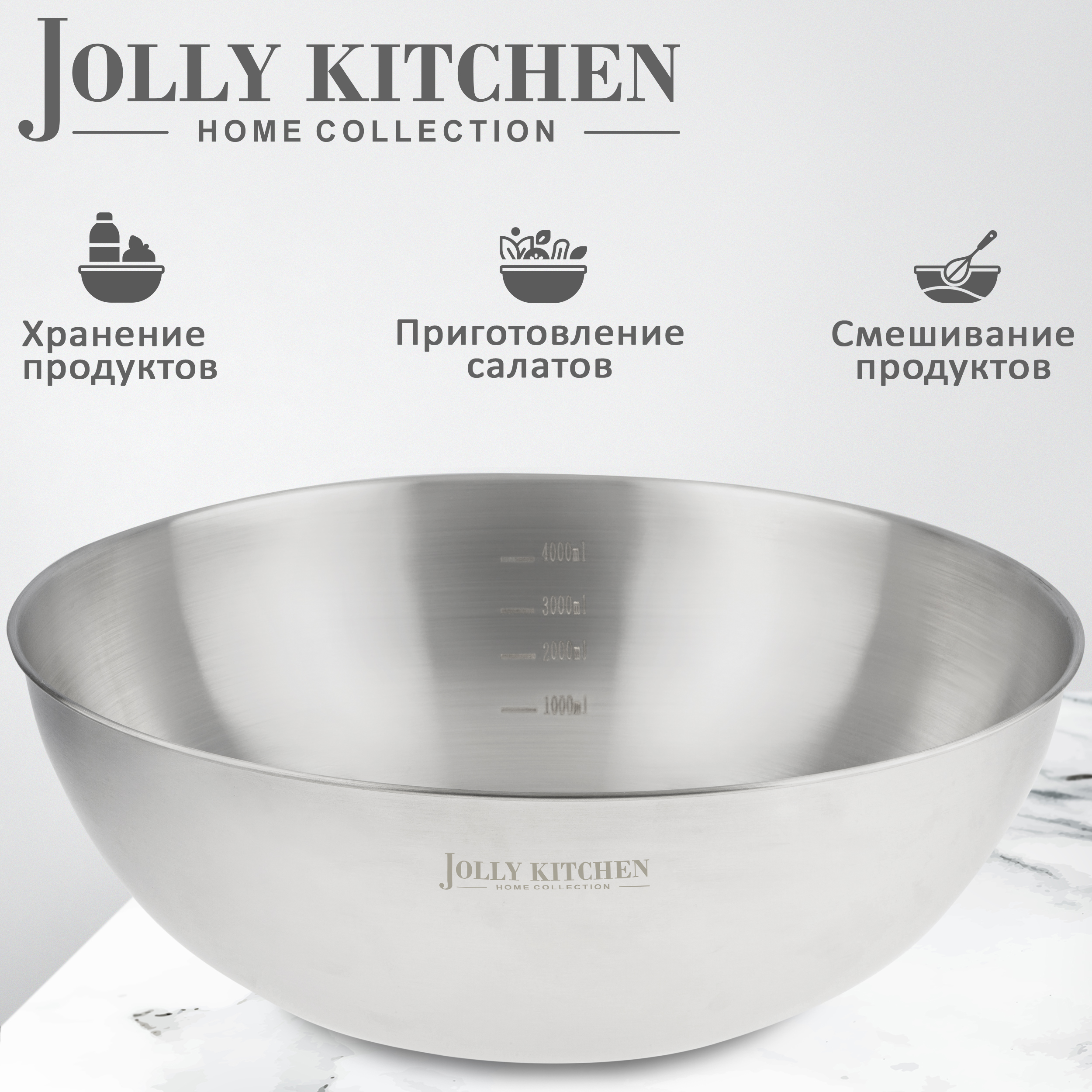 Миска-салатник Jolly Kitchen с мерной шкалой - объемом от 1300 до 4000 мл. Выполнена из прочной нержавеющей стали. Изделие оснащено удобной мерной шкалой. Эта металлическая миска подходит для приготовления и смешивания продуктов, подачи салатов, закусок, гарниров и готовых блюд. Она незаменима дома, на даче, в походах, на рыбалке, пикниках и отдыхе на природе. Модель устойчива к механическим повреждениям, не ржавеет, не впитывает запахи, не окрашивается и рассчитана на длительный срок службы. Миска подходит для хранения продуктов в холодильнике, легкая, компактная и простая в уходе. Благодаря своей универсальности она станет надежным помощником как на кухне, так и в путешествиях.